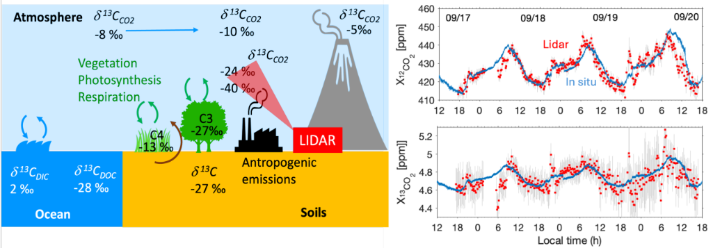 La mesure du rapport de l’isotope stable δ13C du CO2 dans l’atmosphère a le potentiel de caractériser : (1) les processus biogéochimiques d’échanges surface-atmosphère (photosynthèse, respiration), (2) les sources de CO2 (décomposition organique, émissions anthropiques) (3) les écosystèmes (plantes en C3 et C4) et de suivre leur répartition et évolution dans le contexte du réchauffement climatique. Dans ce cadre, le LMD a effectué une première mesure de δ13C par Lidar à partir du sol avec l’instrument COWI (CO2 & Wind Lidar). Ce travail précurseur permet d’évaluer la possibilité d’une mesure aéroportée et spatiale pour apporter une information « processus » ou « origine » à la concentration de CO2 mesurée.