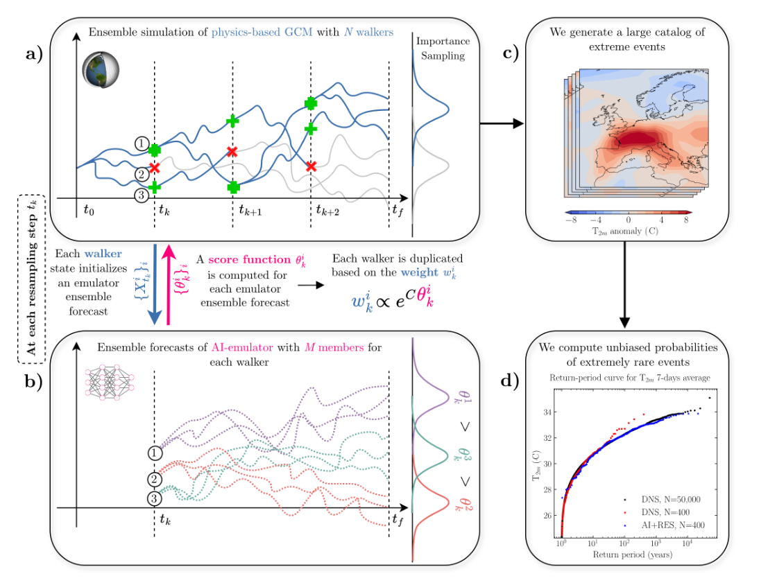 Amaury Lancelin, doctorant au LMD et à RTE, et ses collaborateurs de l’Université de Chicago et de NYU, proposent une solution : utiliser l’intelligence artificielle pour échantillonner les évènements rares (AI+RES), un cadre hybride qui combine un émulateur IA (basé sur l’architecture Pangu-Weather), un modèle climatique physique (PlaSim) et un algorithme d’échantillonnage d’événements rares (Diffusion Monte Carlo).